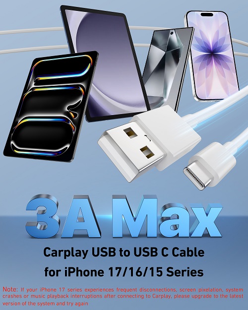 Model Number: A16C17 Manufacturer: Heyuan Renzhi Technology Co., Ltd. Widely Compatibility: This car carplay cable connects and perfect compatible with your iPhone 17/17 Pro/17 Pro Max, iPhone Air 2025, 16e/16 Plus/16 Pro/16 Pro Max/16, iPhone 15/15 Plus/15 Pro/15 Pro Max, iPad Pro 13-inch, 12.9-inch, 11-inch, iPad Air 6th/5th/4th Gen, iPad Mini 6th Gen, Apple TV Remote (3rd Generation), and the car carplay cord also for Samsung, Google, LG, Moto, Android Phones/Auto and more Fast Charge & Sync: Type C to USB charger cord supports efficient fast and safe charging up to 3A, and high-speed data syncing up to 480Mbps for your iPhone 17 16 15 series and USB-C devices Specifically Designed: Built with premium materials, this 3FT USB to USB C cable is lightweight and easy to carry, suitable use for traveling. Whether at home, in the office, or on the go, this cord is versatile and convenient for all your daily charging needs What You Get: 2-Pack 3FT USB A to USB C Cable (White), Worry-free 1 Year Warranty [Note]: Please find siri and search in "Set Phone Settings" before linking to Carplay. Open with "Hey siri, wake up." After opening, use the cable to connect your car to Carplay. If you experience problems with CarPlay functionality, please try the reverse USB C plug and try again