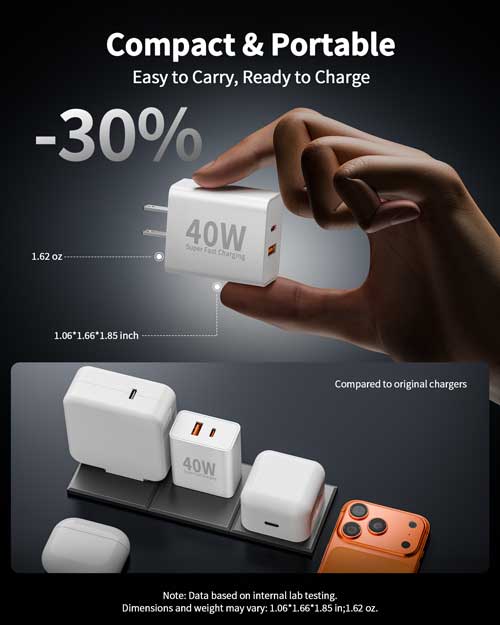 USB C Charger Block, 2-Port 40W Dual USB-C & USB-A Fast Wall Charger Power Adapter Cube PD/QC Charging Block Brick for iPhone 17/17 Pro/17 Pro Max/Air/16/15/14/13/12/11/Pro Max, iPad, Galaxy, Android