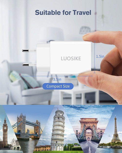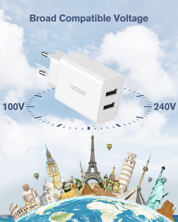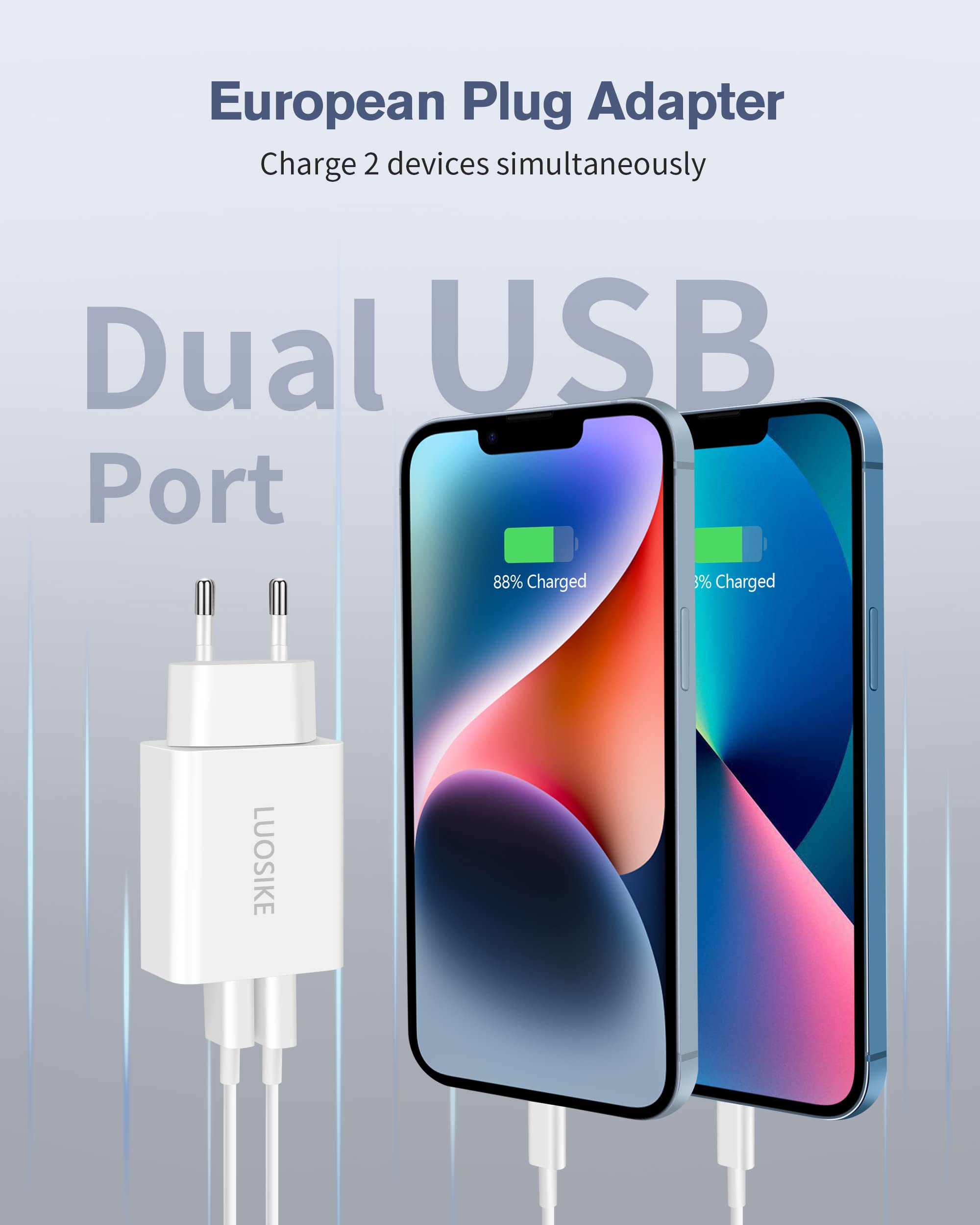 Europe plug adapter with total current output: 5V/2.1A, equipped with 2 USB Charging Ports enables you to charge 2 devices simultaneously at high speed