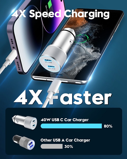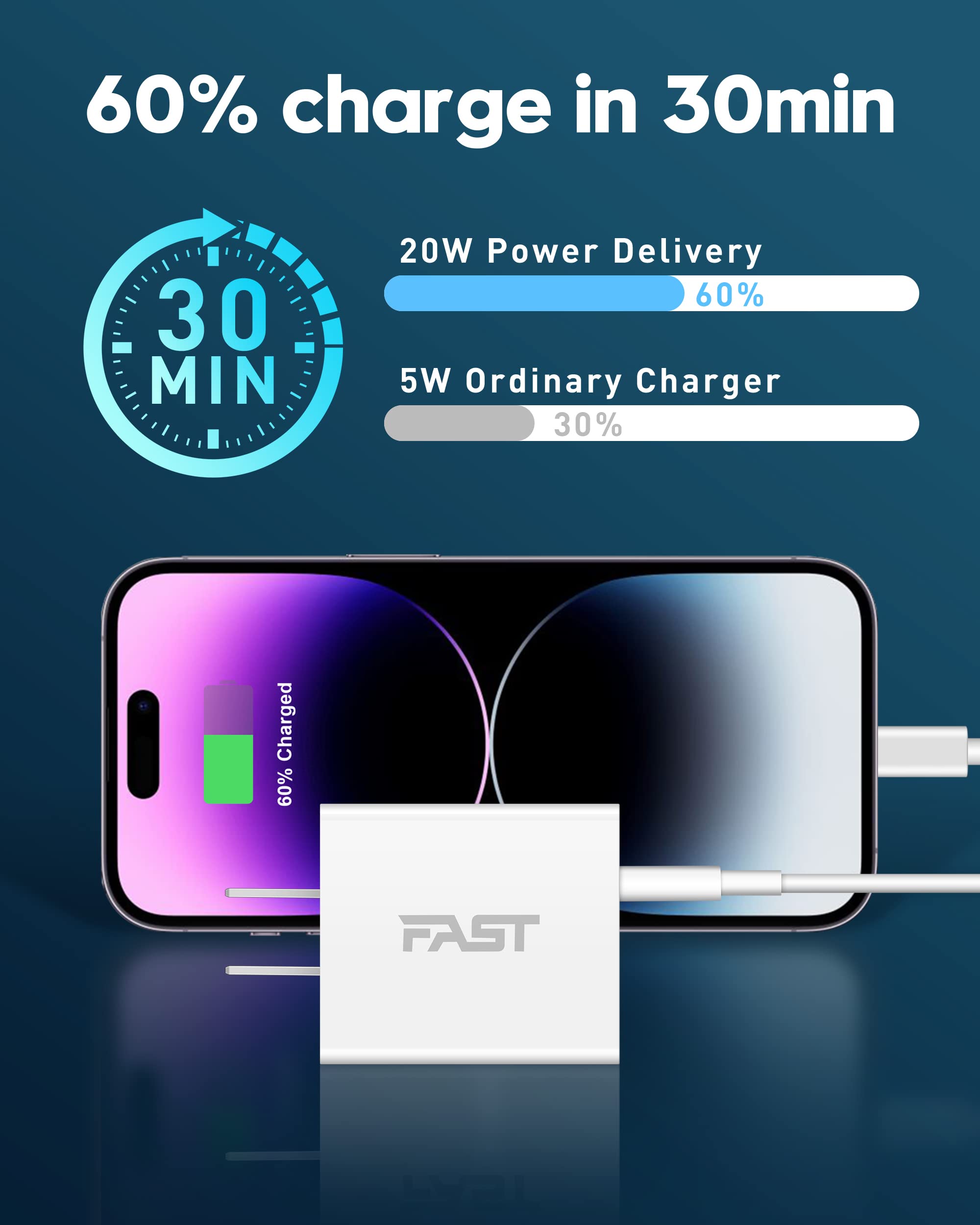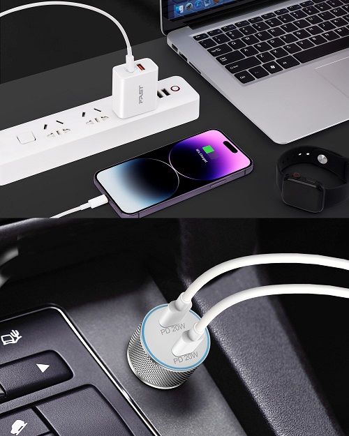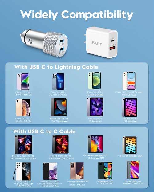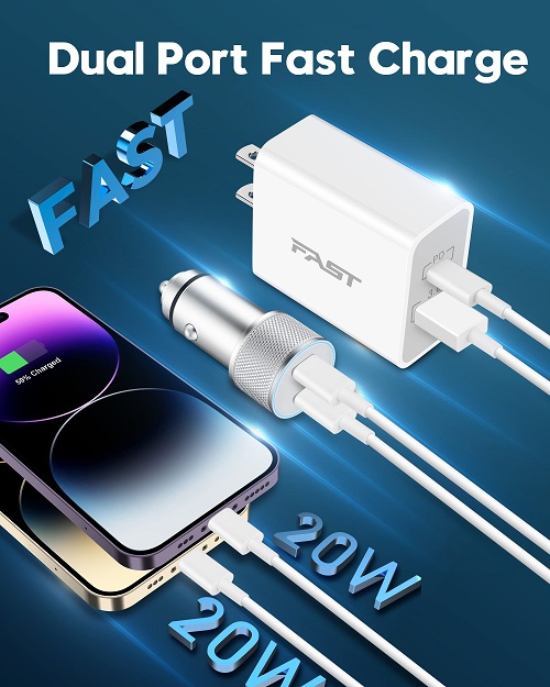 【40W USB C Car Charger】 iPhone car charger is equipped with dual port USB C PD fast charging port, the maximum output power up to 40W, each port output 20W. As its independent PD 3.0 protocol chip, to ensure that 2-Ports can be fast charging simultaneously. The 40W USB-C car charger charges the iPhone 14 from 0% to 50% in 30 minutes, greatly saving your time. 【20W Fast USB C Wall Charger】 USB Wall Charger with a 20W USB-C fast charging port and an 18W USB-A power port, It can charge your two smartphones or tablets at the maximum speed at the same time, 3X faster than 5W charger. 【MFi Certified & Safety Protection】 USB C to Lightning Cable built-in MFi Chip, support 20W USB-C PD fast charging protocol, no warning message pops up.The USB C wall/car charger adapter with multiple safety protection system, can prevent short circuit, over-heating, over-current and over-charging, to protect your connected devices. 【Widely Compatibility】 iPhone fast charger kit support fast charging for iPhone14/14 Plus/14 Pro/14 Pro Max/13/13 Pro/13 Pro Max/13 Mini/12/12Pro/12 Pro Max/12 Mini/11/11 Pro/11 Pro Max/XS Max/XS/X/XR/8 Plus/8, iPad , AirPods. Also standard charging speed works with iPhone 7/7 Plus/6S/6S Plus/6/6 Plus/SE/5S/5/5C. 【What You Get】 1 X 40W Dual Port USB C Car Charger, 1 X 20W USB C Charger Block, 2 X 3FT USB C to Lightning Cable. The Super Fast iPhone Charger kit is ideal for travel and meet your daily charging needs.