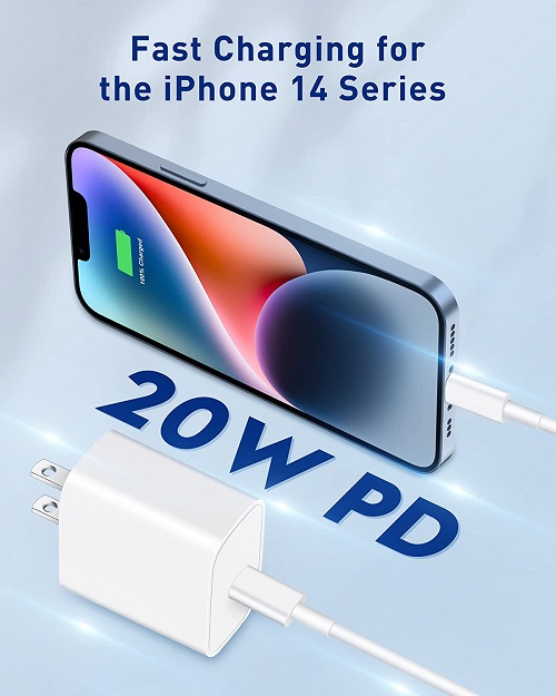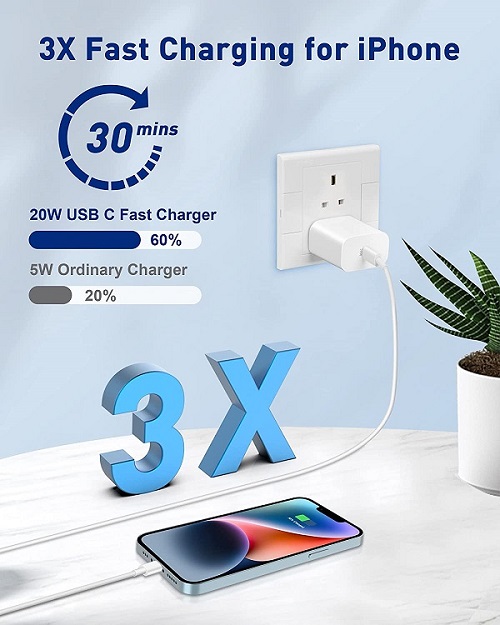 The 20W USB C wall charger provides fast and efficient charging iPhone 14/13 to 60% within 30 minutes. 3X faster than our 5W charger, which greatly saves time.
