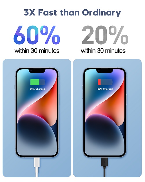 European plug adapter supports max 20W Power Delivery, charges 3X faster than the ordinary 5W charge, USB C charger block fast charging for iPhone 14 up to 60% in just 30 minutes.