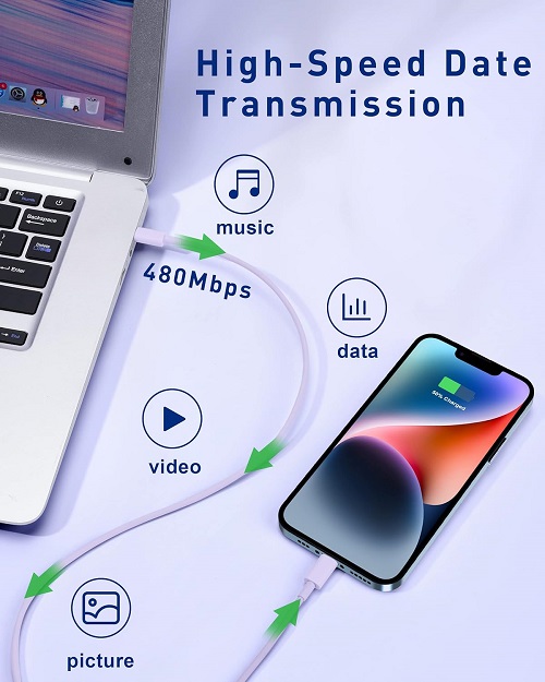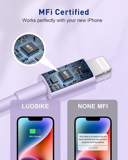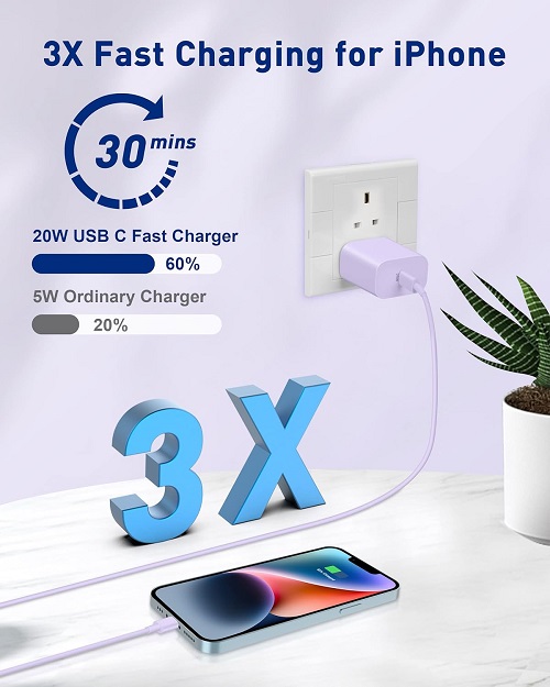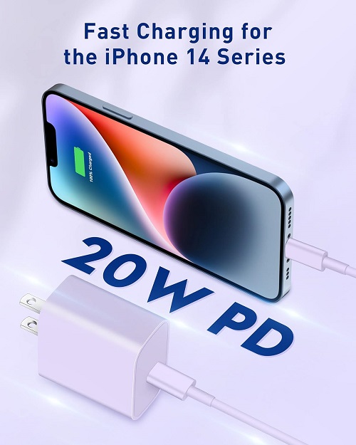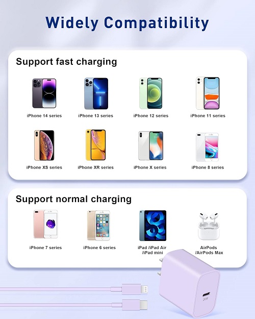 【20W iPhone Fast Charger】 USB C charger block with 10ft USB C to lightning cable provides 20Watt Max output power, charge your iPhone 14/13/12/11 up to 60% in about 30 minutes. 3X Faster than ordinary 5W charger. 【Safe & Reliable】 Apple charger USB-C power adapter built-in multiple safety protection system, avoiding over-heating, over-voltage, over-charging, short circuit, etc. The MFi Certified smart chip can automatically match the current required by Apple devices and quickly, safely and stably charge iPhone/iPad/Accessory. 【Apple MFi Certified Lightning Cable】10FT Long lightning cable equipped with latest upgraded Apple MFi chip, no warning message pops up. Extra long 10foot designed can be used anywhere to meet your different needs. 480Mbps high speed data transfer and 15000+ bending tests. 【Universal Compatibility】20W Apple fast charger compatible with iPhone 14/14 Plus/14 Pro/14 Pro Max/13/13 Mini/13 Pro Max/SE 2022/12/12 Mini/12 Pro Max/11/XS Max/X/XR/8 Plus, iPad Air/Mini, AirPods. Standard charging speed for iPhone 7/7 Plus/6/6S Plus/SE/5S/5/5C. 【What You Get】 1 * 20W USB C Wall Charger (Purple), 1 * 10FT USB-C to Lightning Cable (Purple). 24/7 friendly customer service. If there are any problems or damaged products, please do not hesitate to contact us.