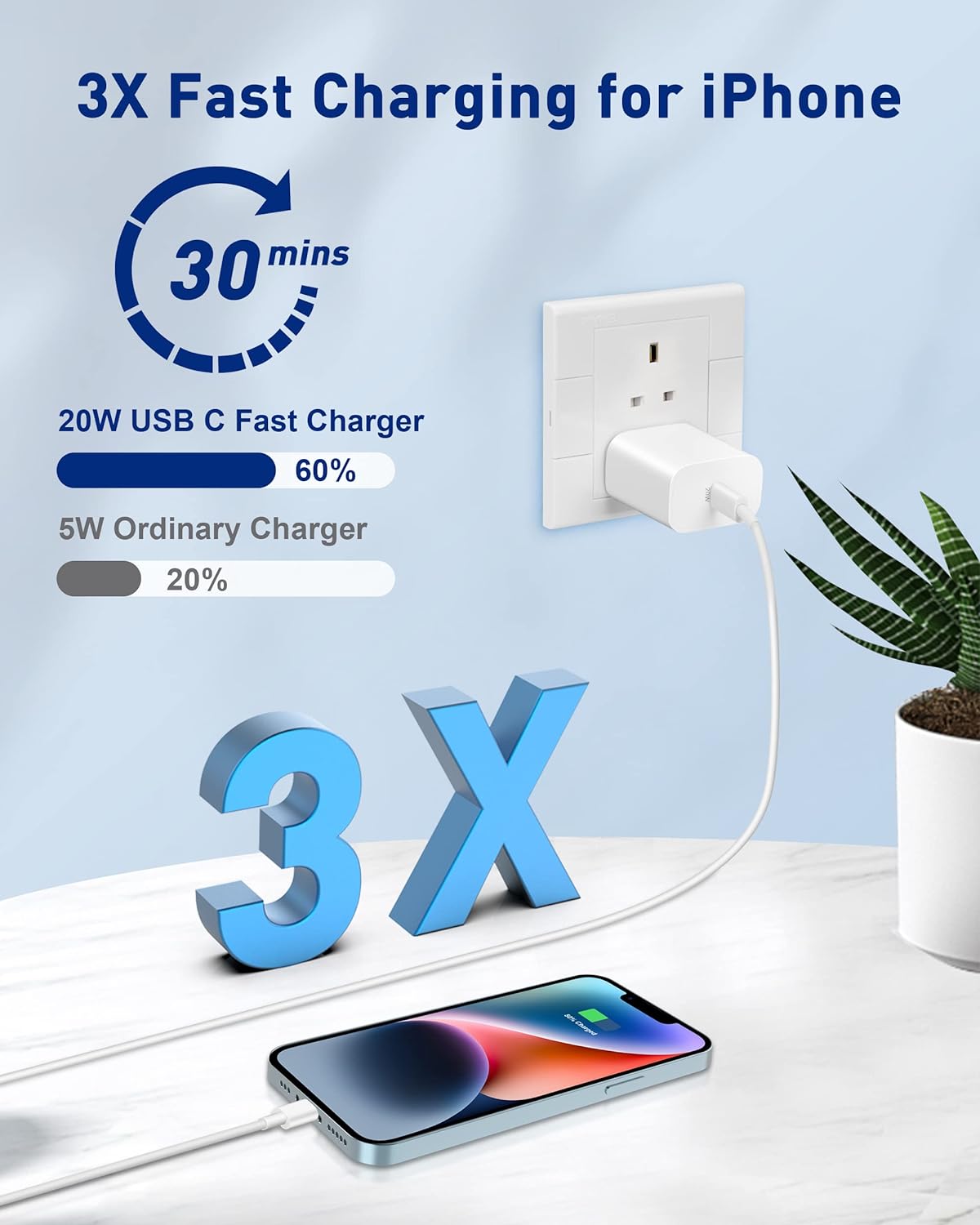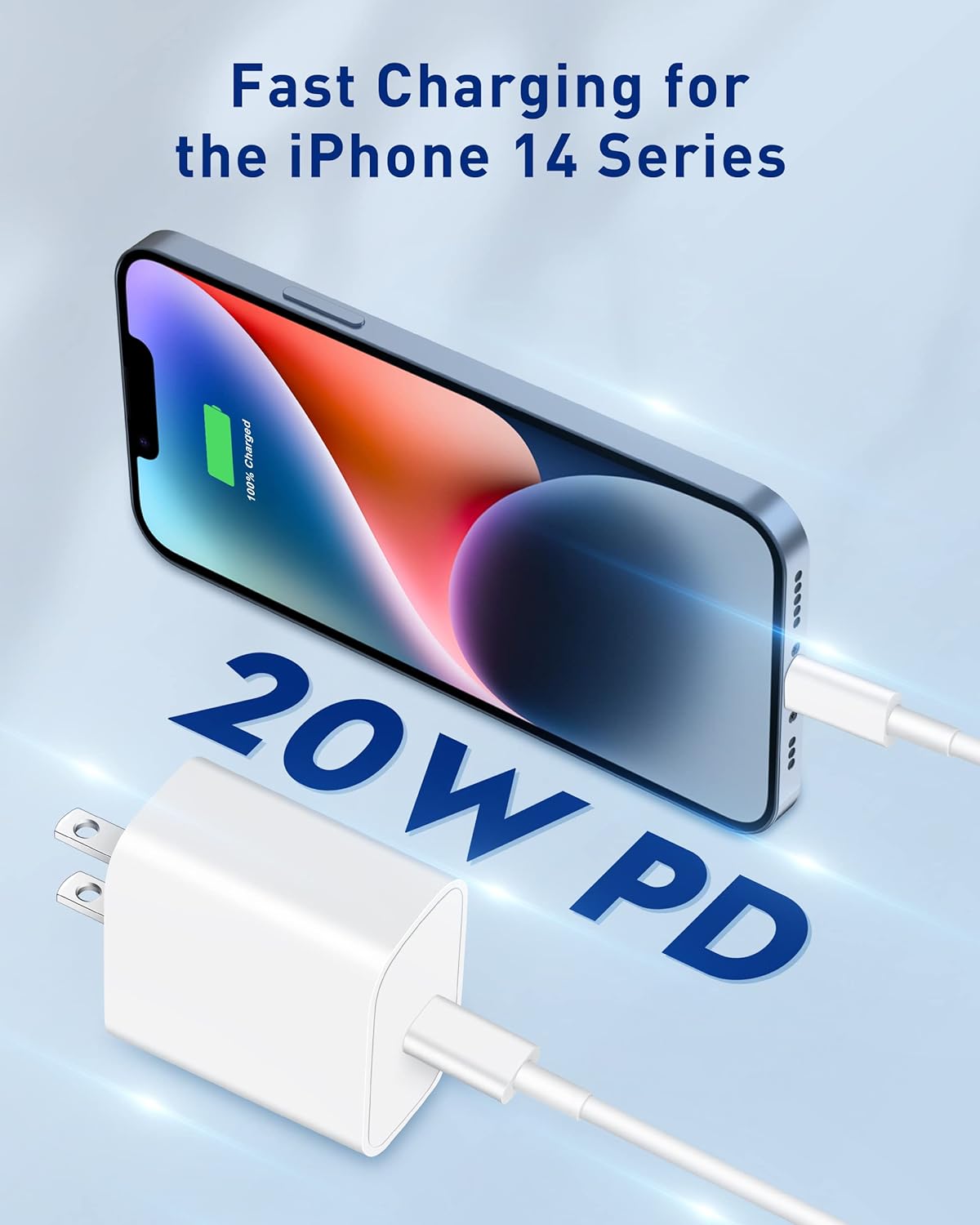 The 20W USB-C wall charger and 10FT iPhone charging cord reach up to 3X faster than the 5W charger, charge iPhone 14 up to 60% in 30 mins, fully charged in 1.8 hours saves 1.5 hours of time.