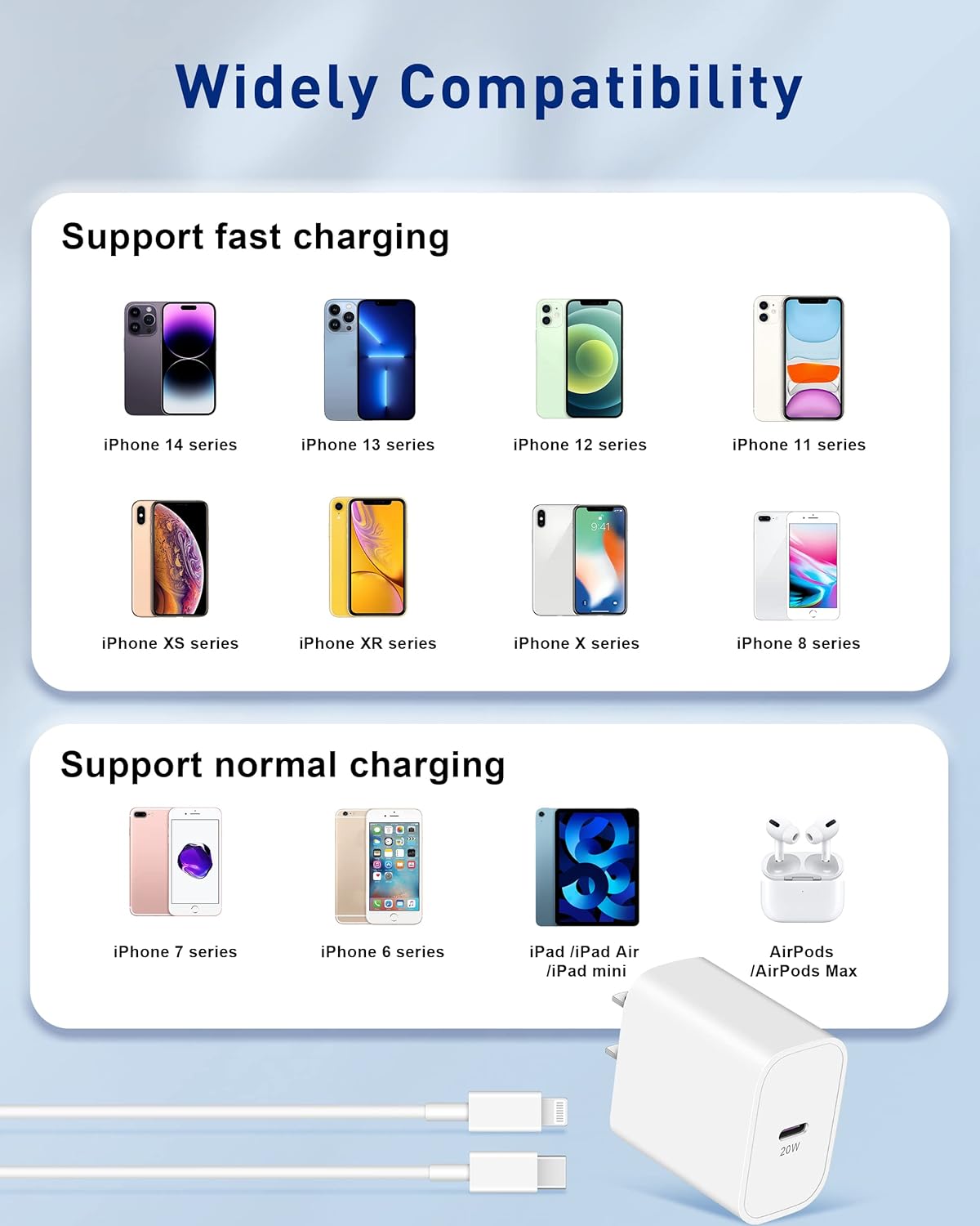 20W Power Fast Charging: The USB C charger block with Power 3.0 technology and PD fast port, provides up to 20W of output power. Fast charge for iPhone 15 to 60% battery in just 30 minutes, and only takes 1.8 hours to fully charge the iPhone, saving you 1.5 hours. MFi Certified 10FT Lightning Cable: Equipped with MFi certified chip, 10foot USB C to lightning cable recognizes your devices directly, ensures 100% flawless compatibility with your iPhone/iPad, fully support with iOS versions. Extra long 10FT iPhone charger cord is convenient for usage while charging and syncing at home/office/travel/hotel, and more. Wide Compatibility: The 20W Type-C fast charger is designed for New iPhone/iPad. USB C power adapter fast charging for iPhone 14/14 Pro/14 Pro Max/13/13 Mini/13 Pro/13 Pro Max/12/SE3 2022/11/XS/XS/XR/X/8 Plus, and charge iPhone 7 6 6S Plus 5S SE at an original charging speed. Superior Safety: 20W USB C charger block has multi-protect safety system ensures complete protection for your devices, built-in over-voltage, over-heating, over-currents protection, quickly, safely and stably charge for you. The smart chip automatically matches the current required, avoiding potential safety hazards caused by excessive power and overheating during charging. What You Get: 3 x 20W USB C Wall Charger, 3 x 10FT USB C to Lightning Cable (White).