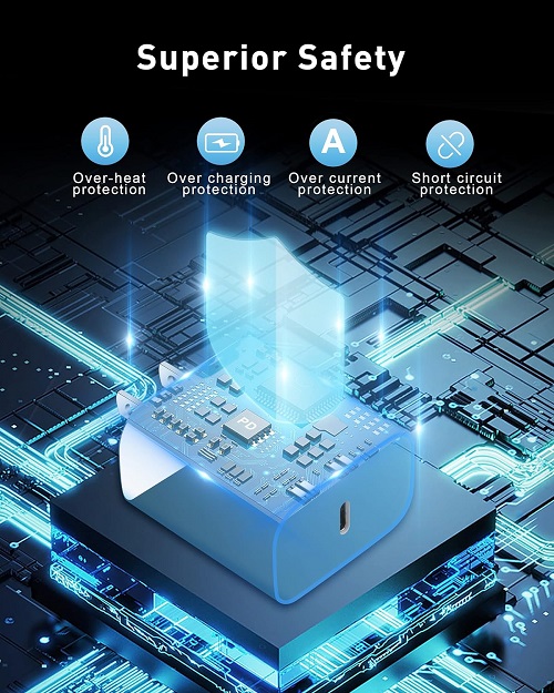 Fireproof material. USB C power adapter fire proof shell and over charging, over currents, and over heating. Charging stops when battery is full.