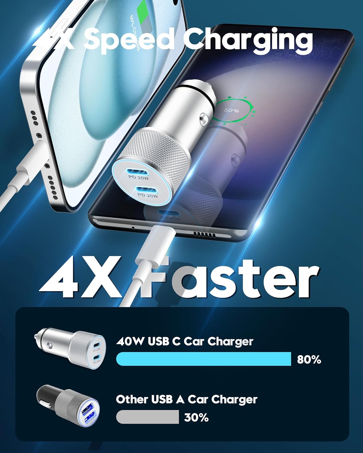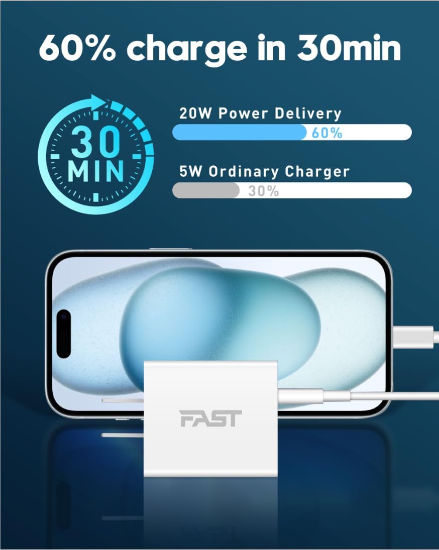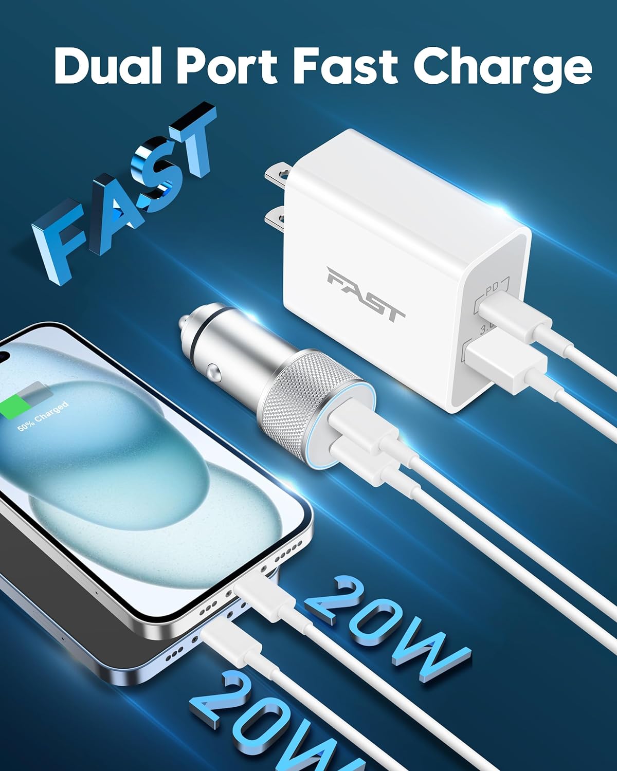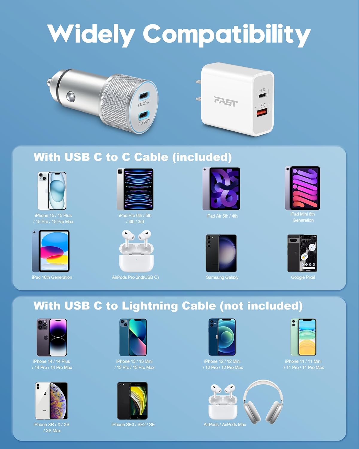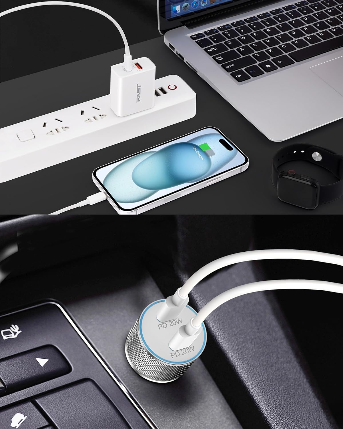 【20W Fast Charging】 USB C Charger Block with dual port PD+QC design, can charge two devices simultaneously, enjoy high-speed charging with 20W max output for your new iPhone 15 Series. 【Design for New iPhone and iPad】 20W USB C Charger fast charge for iPhone 15/15 Plus/15 Pro/15 Pro Max, iPad Pro 12.9 inch 6th/5th/4th/3rd, iPad Pro 11 inch 4th/3rd/2nd/1st, iPad 10th Generation, iPad Air 5/4, iPad Mini 6. The type c charging block also fast charge for Samsung Galaxy S23/S22/S21/S20/Note 20/10/Z Flip 5/Z Fold 5, Google Pixel 7/7 Pro/6/6 Pro/5/4 XL. 【3-Foot USB-C to USB-C cable】 Includes 2Pieces 3FT USB C to USB C fast charging cables, with a thickened copper wire design that increases its service life by 3X longer. Tested in a laboratory environment to withstand 15000+ bends. The type c cable is long enough to easily charge for your iPhones and iPads in the bedrooms, sofas, offices and business trip. 【40W USB C Car Charger】Equipped with dual USB C fast charging port, the maximum output power up to 40W, each port output 20W. As its independent PD 3.0 protocol chip, to ensure that 2-Ports can be fast charging simultaneously. The 40W USB-C car charger charges for iPhone 15 from 0% to 60% in 30 just minutes, greatly saving your time. 【What You Get】1 X 20W USB C Wall Charger Block Power Adapter, 1 X 40W Dual Port USB C Car Charger, 2 X 3FT Type C to Type C Cable. The Super Fast USB C Charger Kit is ideal for travel and meet your daily charging needs.