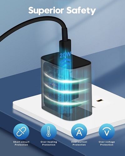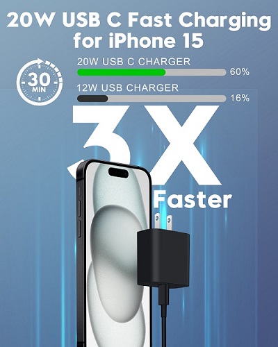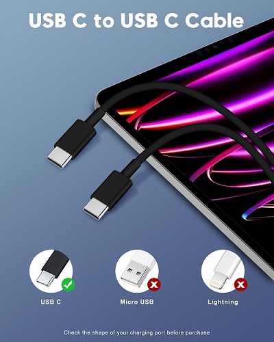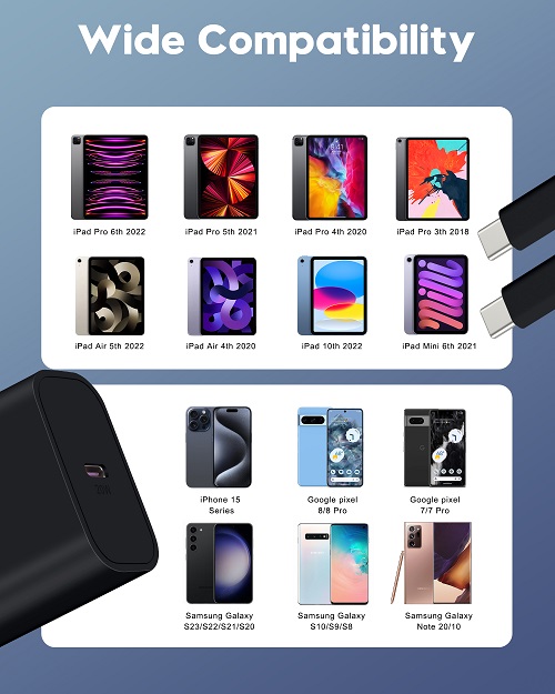 20W iPhone 15 charger iPad Pro Charger: 20W PD USB C fast wall charger with USB C to C charger cable provides you max 20 watt output power, fast charging for the iPad Pro/Air/Mini, iPhone 15 series. Full charge iPad Pro in 2.5 hours, 3X faster than 5W USB charger. Widely Compatibility: USB C fast charging block for iPhone 15/15 Pro/15 Pro Max/15 Plus, 2022/2021/2020/2018 iPad Pro 12.9/11 inch 6th/5th/4th/3rd, 2022 new iPad 10th Generation, iPad Air 5th/4th, iPad Mini 6. Also compatible with Google Pixel 8 Pro/8/7 Pro/7/6 Pro/6a/6/5a/5/4XL/4a/4/3XL/3, and more USB-C devices. 6FT Long iPad Charger Cord: With the intelligent chip Type-C to C cable can charge iPad pro 12.9 with 3A charging speed. Friendly reversible design, support 480Mbps data syncing between your devices and laptop. 6FT length can give you more space to move while charging. Safe & Efficient Charging: USB-C power adapter built-in multiple protection system to avoid over-voltage, over-charge, over-heating, etc. Equipped with upgraded smart chips automatically matches the current required by devices, quickly, safely, and stably charging your iPad/iPhone. What You Get: 2 X 20W USB C Wall Charger (Black) and 2 X 6FT USB C to Cable (Black). 24*7 Friendly customer service, if there are any problem, please contact us.