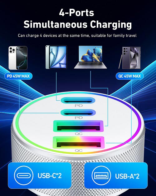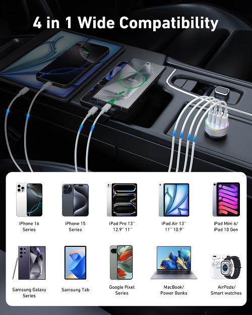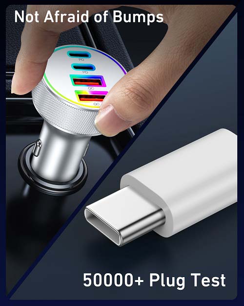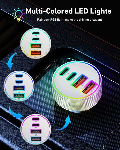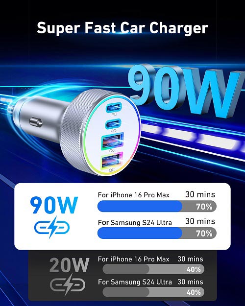 90W Super Fast Car Charger: The USB C car charger delivers max 90W fast and efficient charging for your iPhones/iPads/Android Phones. Powers up for your iPhone 16/15 series and Samsung S24/S23 series to 70% battery in about 30 minutes 4-Ports Simultaneous Charging: 90W Multi port car phone charger is equipped with two USB-C and two USB-A ports, can fast charging 4 devices simultaneously. This car charger supports PD 45W(Max) and QC 45W(Max) high output, can works with all prevailing phones and E-devices Universal Compatibility: One for all ( 1x 90W 4-Port USB C car charger + 2x 3FT USB C to C cable). Compatible with iPhone 16/16 Plus/16 Pro/16 Pr Max/15/15 Pro Max/15 Pro Max/15 Plus, iPad Pro/Air/Mini, Samsung Galaxy S24/S23/S22/Ultra/S21/S20/S10/S9/S8 Plus, Note 20/10/9, Galaxy A12/A13/A22/A32/A53/A54/A55, Google Pixel 9/9 Pro/9 Pro XL/9 Pro Fold/8/7/6/5/4/3 XL, LG, Moto, Watches, Car Recoders, Android Phones and more Multi-Colored LED Lights: LED lights allow you to easily find the port to charge your device in the dark. And it emits the right amount of light to let you know at a glance whether the usb car charger is successfully connected to the power supply or not, but not too bright to distract you Superior Safety: The car charger cigarette lighter adapter adopts all-aluminum shell design, faster heat dissipation. And equipped with an intelligent power management chip, which can adjust the input power of the phone to prevent overcharge, overcurrent, overheating and short circuit
