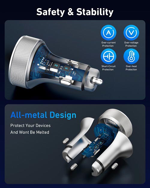 The high-density aluminum alloy shell can help your Phone to dissipate heat in the charging process, effectively improving the charging efficiency by about 15% compared to plastic car chargers, and absolutely no melting and danger.